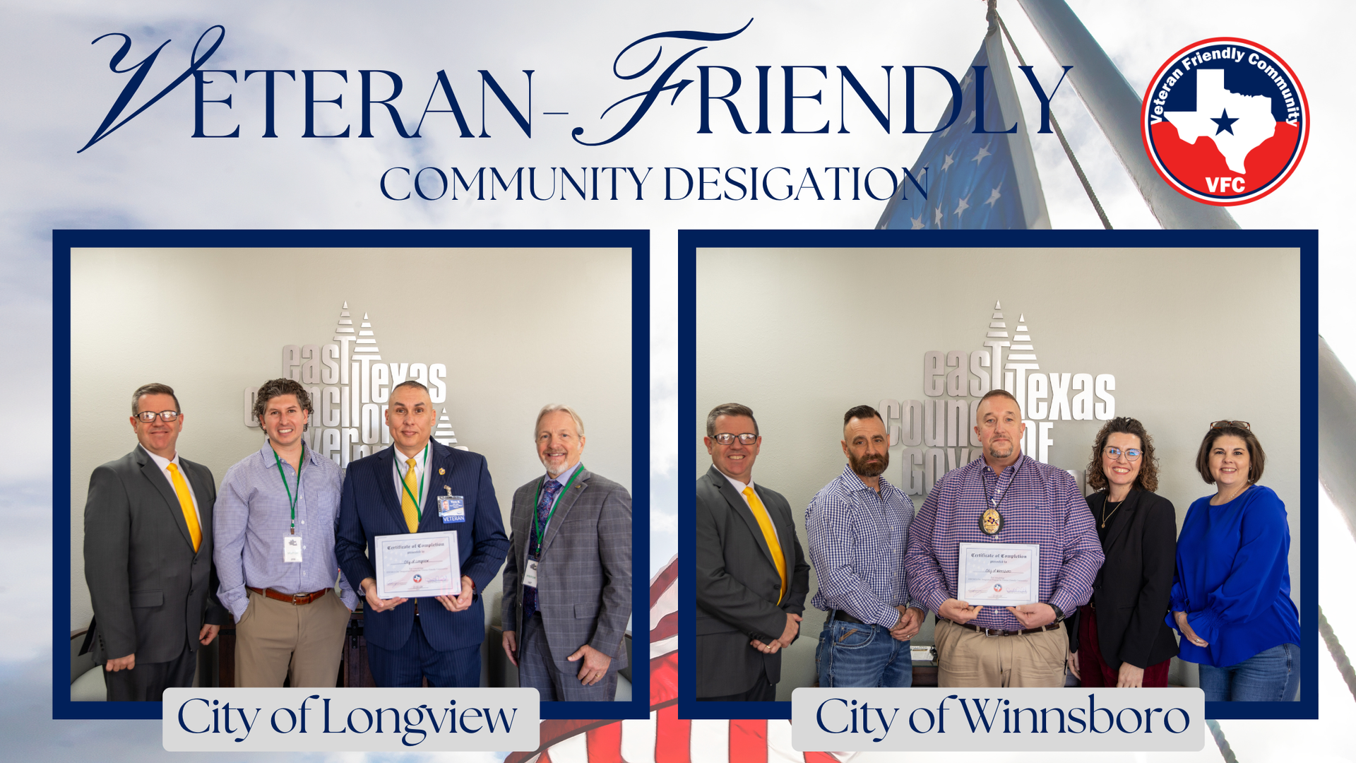 At its February meeting, the East Texas Council of Governments Executive Committee awarded the City of Longview and the City of Winnsboro as this year’s recipients of the Veteran-Friendly Community Designation. The Veteran-Friendly Community Designation program was created in 2025 to recognize communities that actively welcome and support veterans and their families by meeting real needs in everyday life. In its first year, ETCOG designated the City of Tyler/Smith County and the City of Quitman/Wood County as the program’s inaugural Veteran-Friendly Communities. A Veteran-Friendly Community is defined as one that provides ongoing support in areas including employment, housing, transportation, health care, education, and overall quality of life. Communities seeking designation were required to meet established standards, including: Provide proof of community and organizational support. Submit a comprehensive community profile with key information for veterans and their families, including demographics, housing, and healthcare access. Maintain a community development strategy that directly addresses veterans’ needs. Complete an initial and annual self-assessment to identify service gaps and guide improvements. “Recognizing Longview and Winnsboro as Veteran-Friendly Communities reflects the real work these cities are doing for the men and women who served our country,” said ETCOG Executive Director David Cleveland. “Veterans deserve more than words of thanks. They deserve access to jobs, healthcare, housing, and support systems that help them build strong lives at home. These communities are setting the standard for what that looks like in East Texas.” “Programs like this help communities take a clear look at what they’re doing well and where they can grow,” said ETCOG Special Projects Director David Scott. “It’s about making sure veterans can live, work, and raise families in places that value their service and invest in their future.” With continued interest from communities across the region, ETCOG plans to reopen the application process annually to allow more cities and counties to pursue the Veteran-Friendly Community Designation.